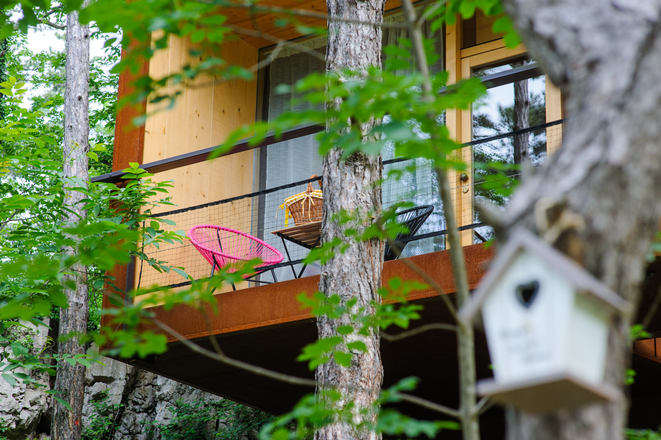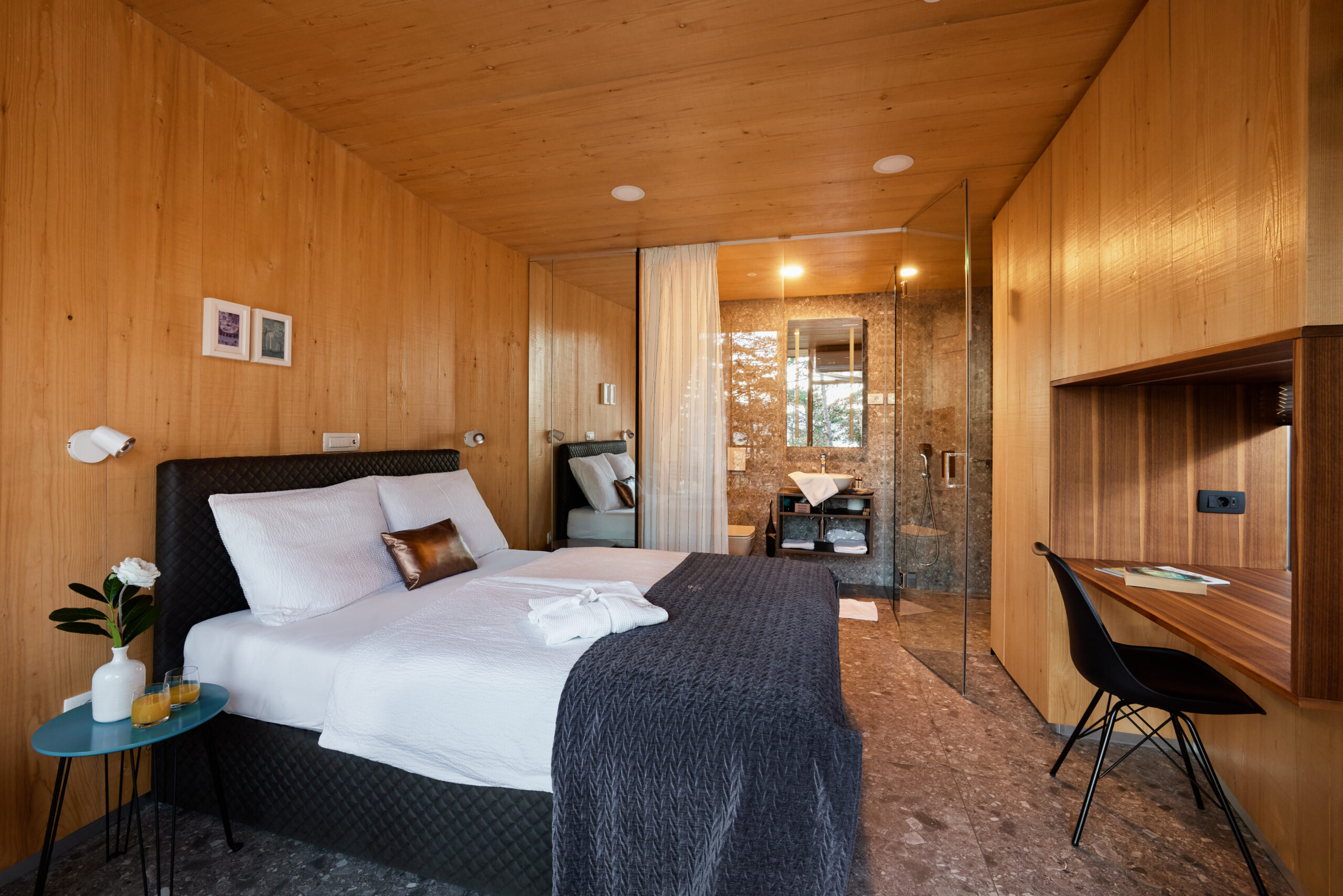 The romantic nest offers a comfortable and relaxing retreat in the Vipava Valley. The modern and elegant room impresses and conjures up an unforgettable experience of living among the canopy of century-old pine trees.