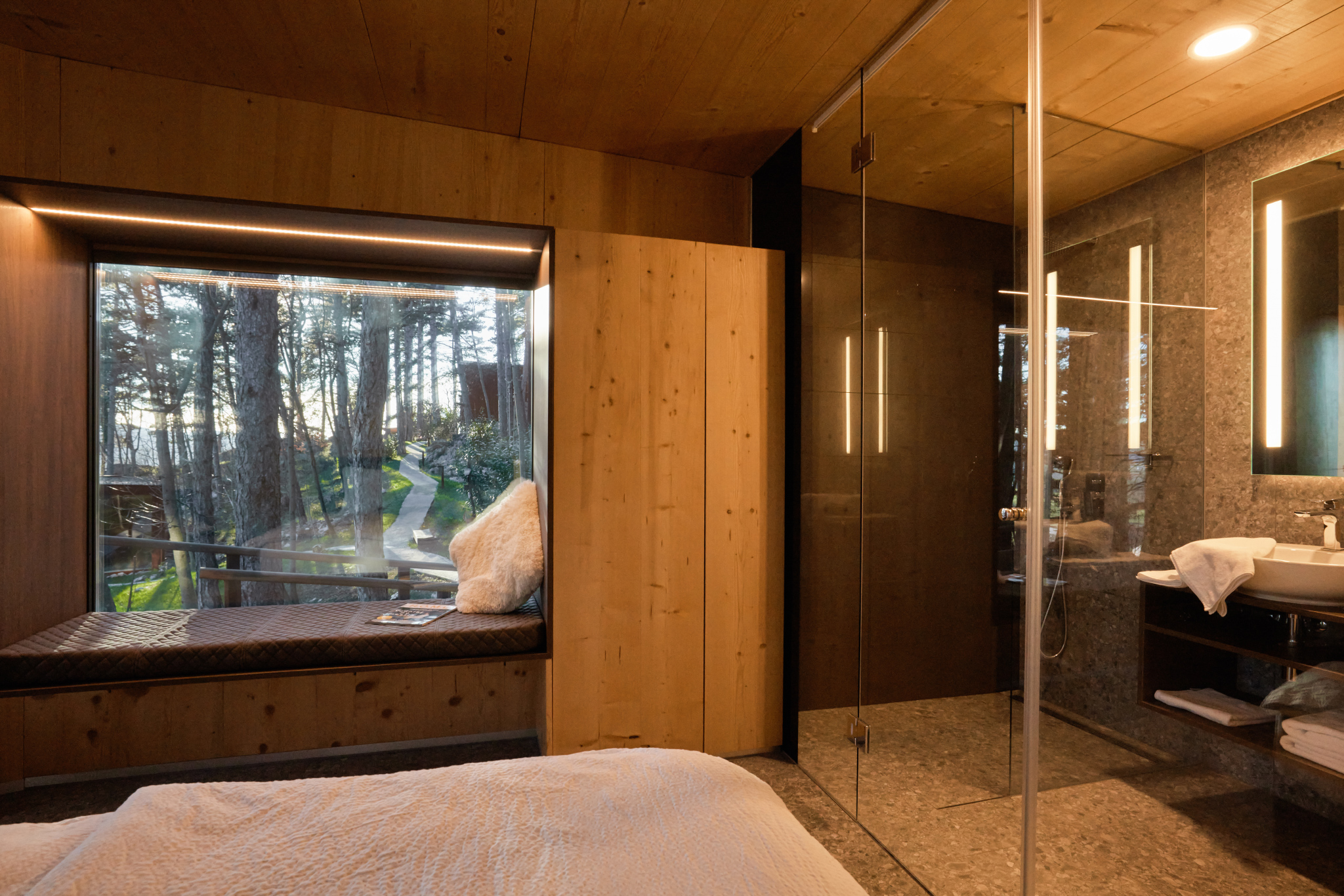 The meticulous placement of our wooden cabins and their contemporary design blend and combine perfectly with the rocky terrain below them. Nightfall brings a peaceful slumber, followed by a one of a kind awakening in the middle of pristine nature.