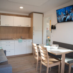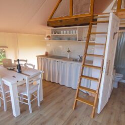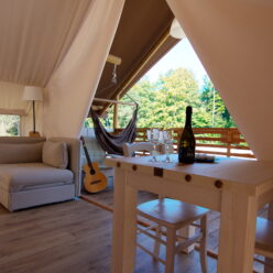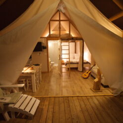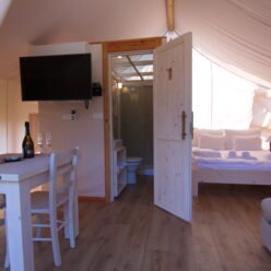 The tents are seasonal, open from the end of April to the beginning of October, and offer all the comforts of home for such sophisticated tastes. All accommodation units are equipped with modern amenities to ensure a perfect quality of life: living room, bedroom, kitchen with all necessary equipment, private bathroom with shower and toilet, air conditioning, heating, terrace with garden furniture.