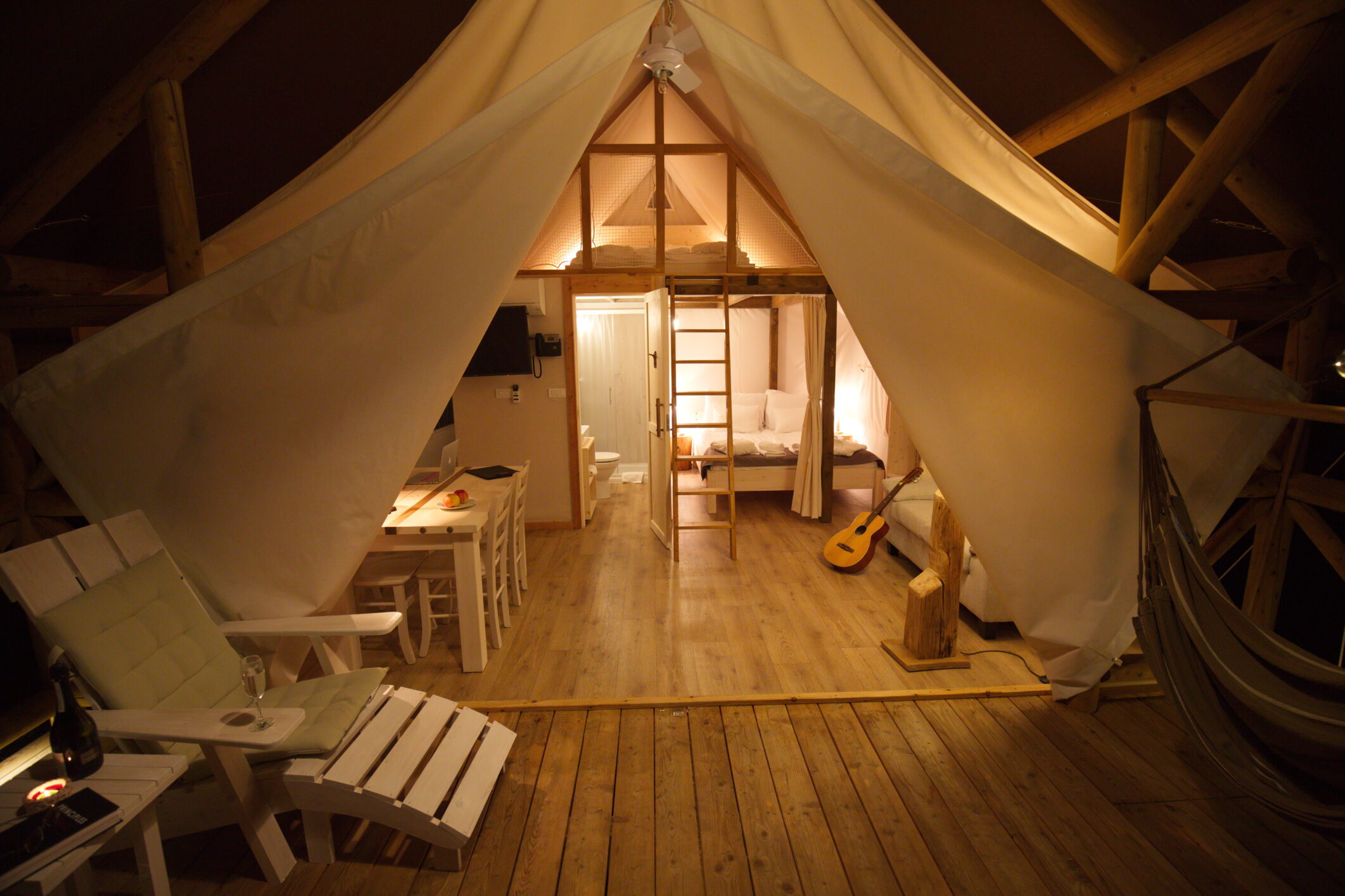 The resort offers all-year-round living pleasure in 22 villas, and during the summer days in 11 adventurously furnished tents of different size: for 2, 4 or 6 guests.