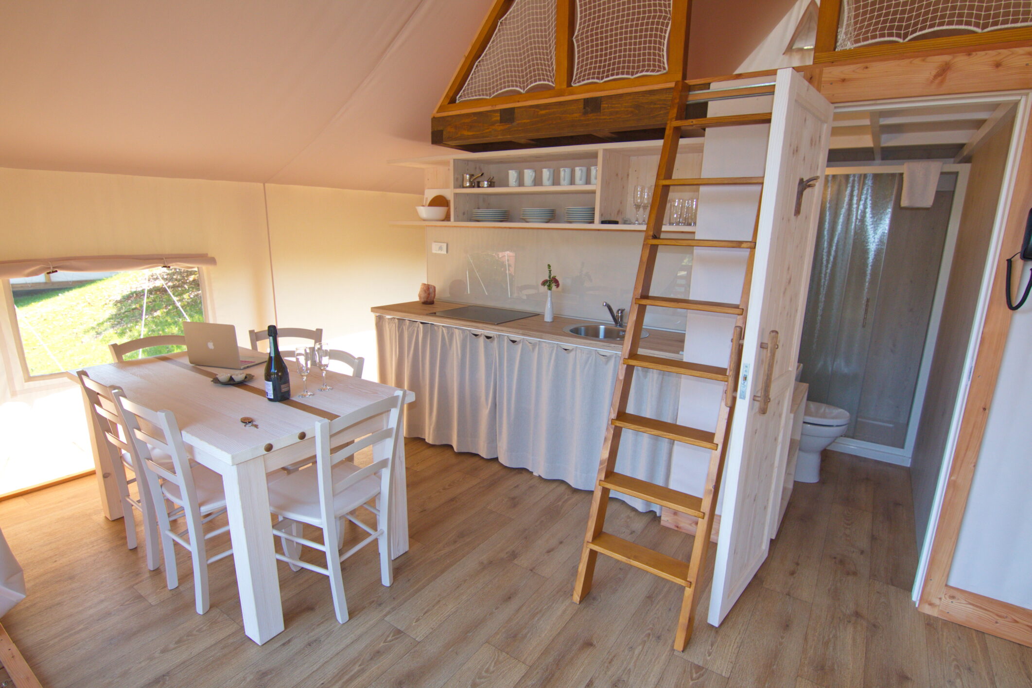 The tents are seasonal, open from the end of April to the beginning of October, and offer all the comforts of home for such sophisticated tastes. All accommodation units are equipped with modern amenities to ensure a perfect quality of life: living room, bedroom, kitchen with all necessary equipment, private bathroom with shower and toilet, air conditioning, heating, terrace with garden furniture.