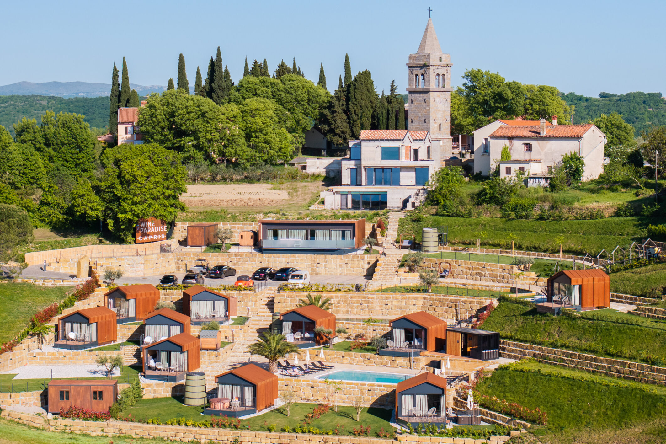 The glamping village Wine Paradise is located in the iconic Istrian village of Marezige, which is considered the very center of the Land of Refosco. The glamping village consists of 11 houses, which are characterized by modern interiors and luxurious comforts such as hot baths, saunas, and large swimming pools. Modern houses set in a rustic Istrian environment definitely offer a unique experience.