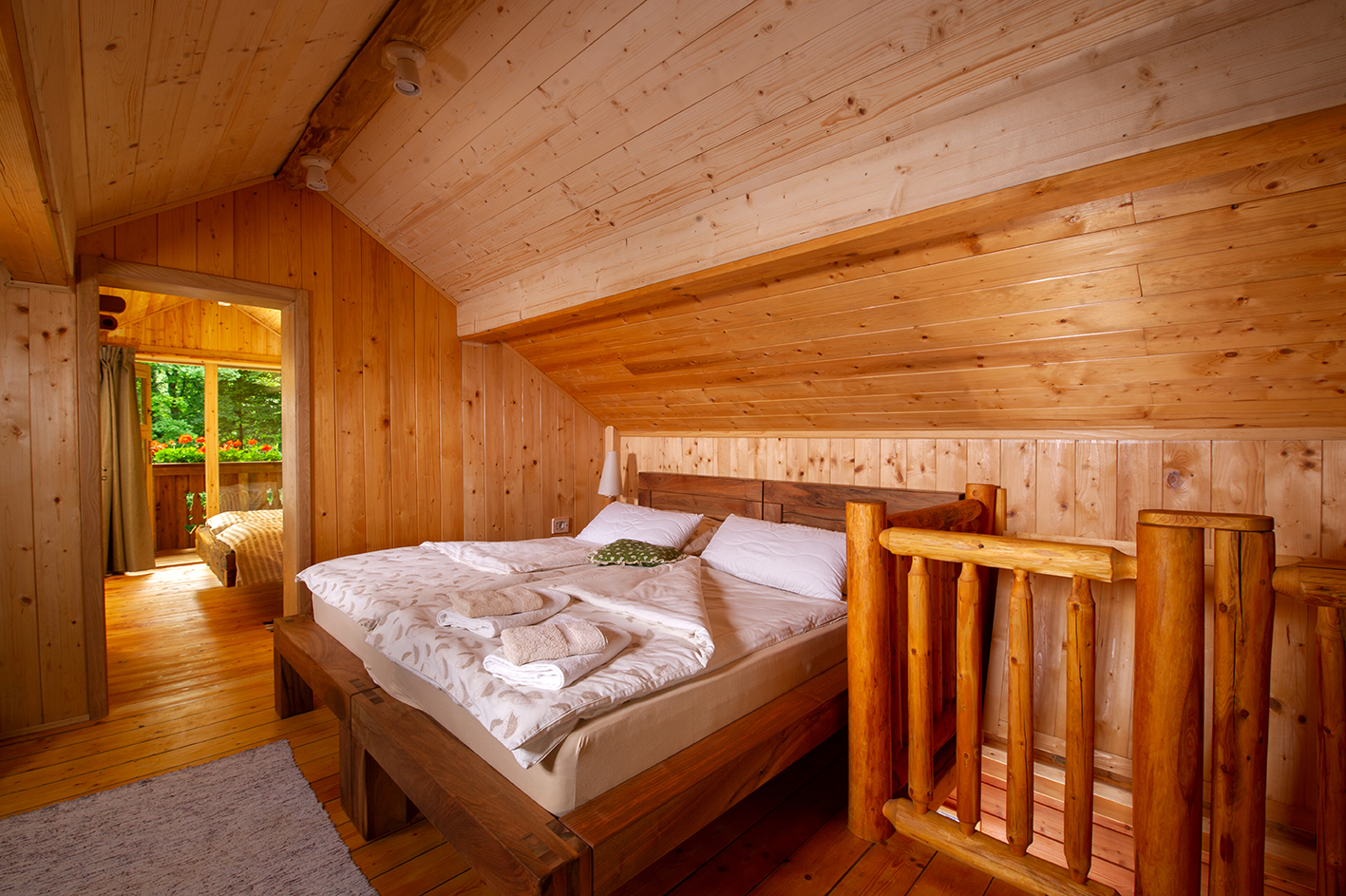 Each lodge has two beds and the possibility of an extra bed for a child. On the South side of the lodge, there is a panoramic window overlooking the River Savinja and a spacious wooden terrace. The lodges are equipped with mini fridges. There are also towels and bed linen available.