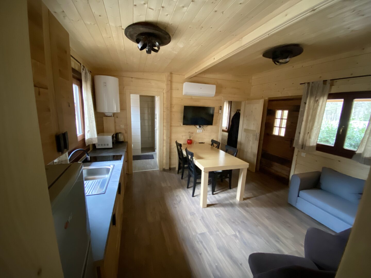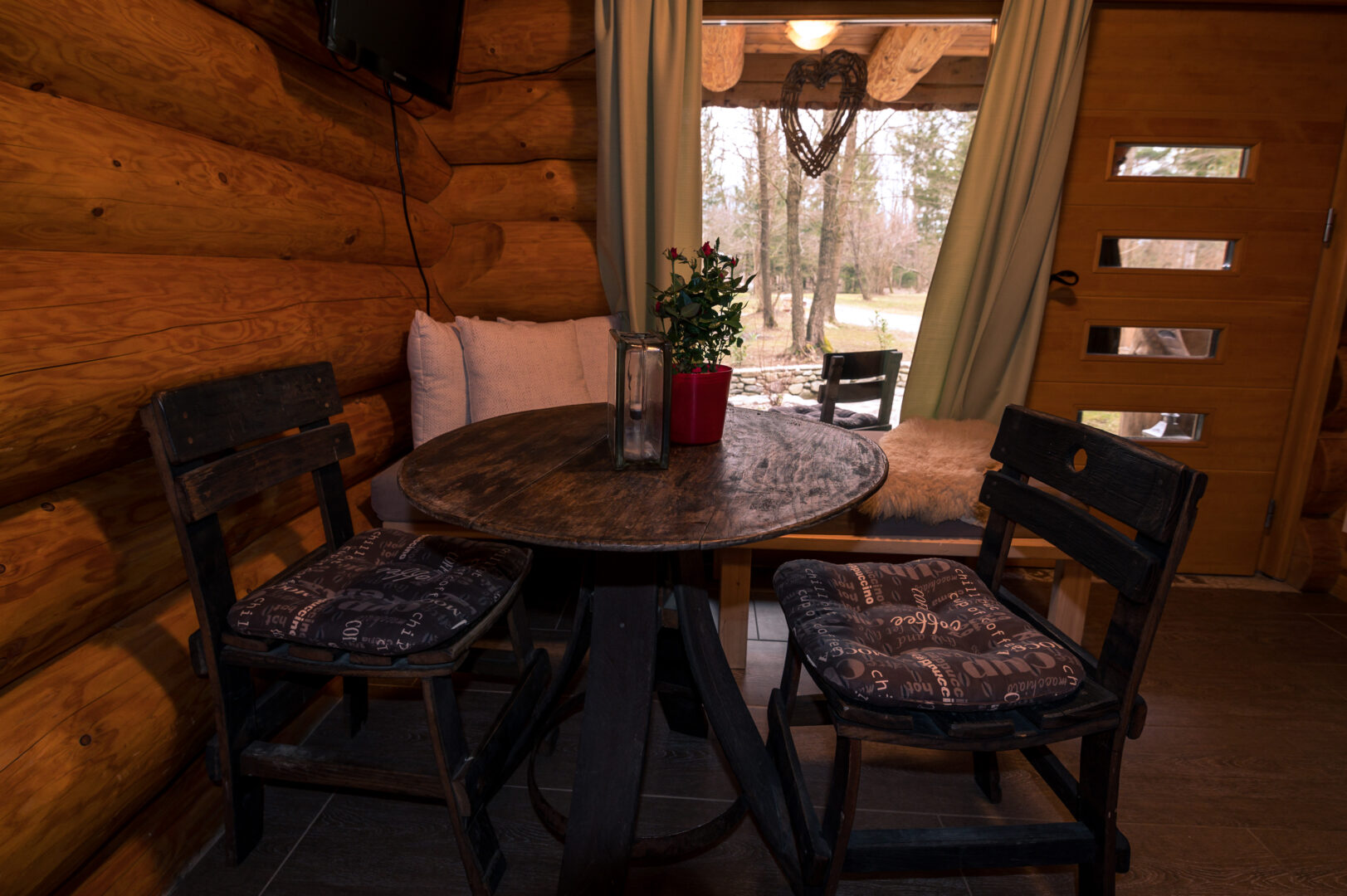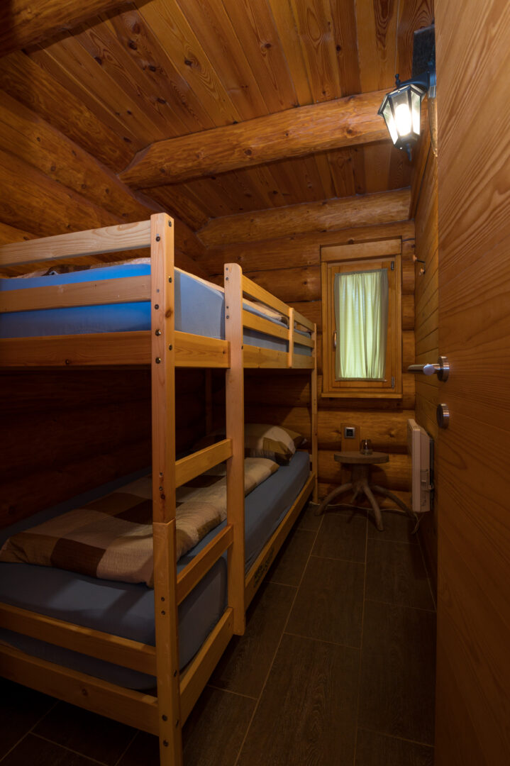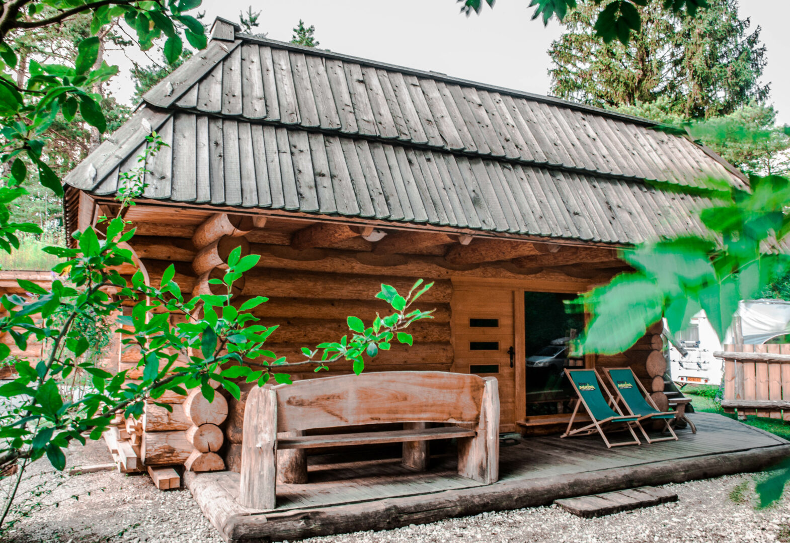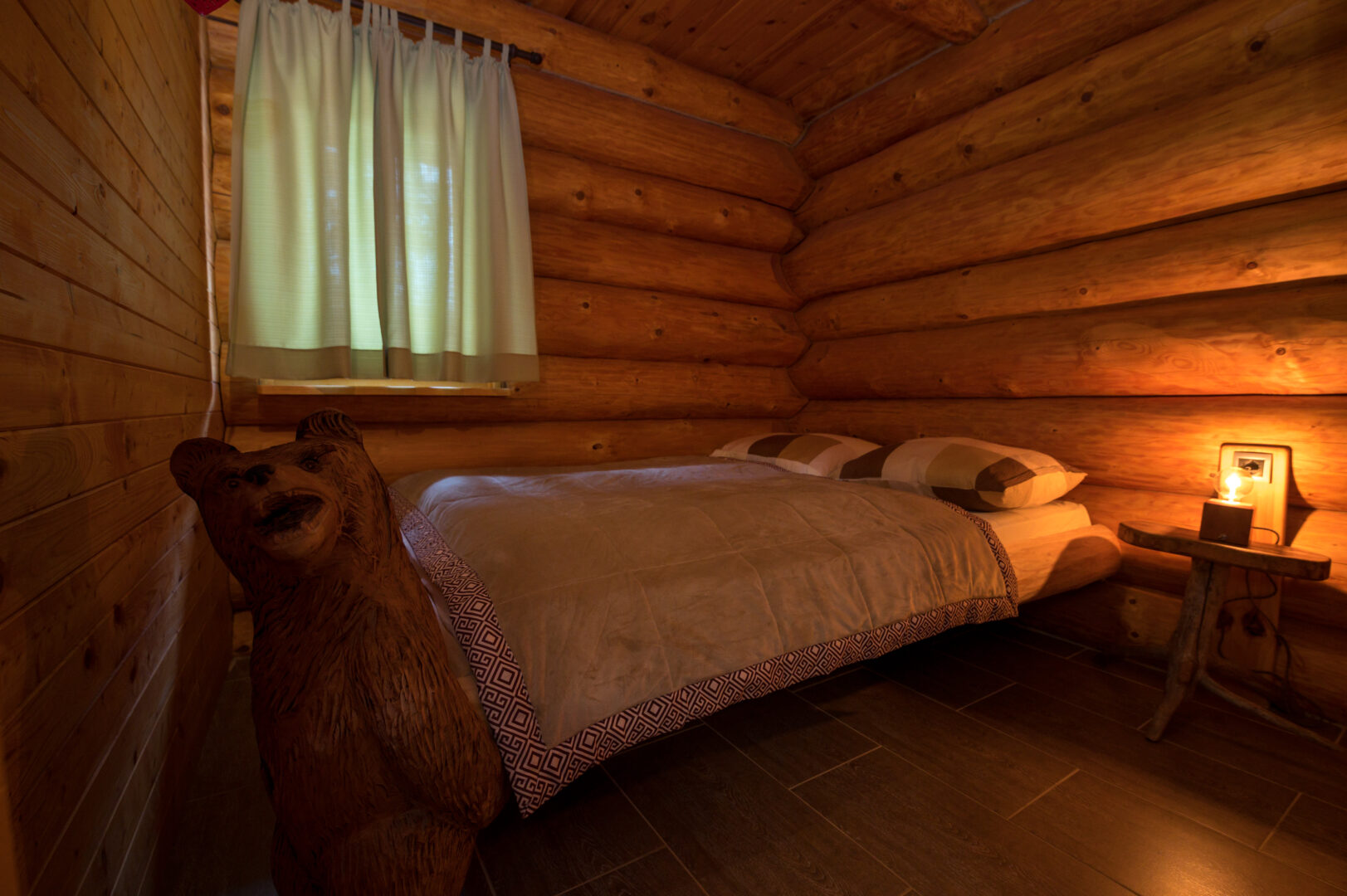 Celotna okolica kampa Menina je poraščena z gozdom in skladno z lokalno podobo, sta naši glamping hiški zgrajeni iz lesenih hlodov iz okoliških gozdov. Hiški z imenom Medov brlog ali Bear Lodge, ponujata najvišje možno udobje, glamping v pravem pomenu besede. Hiška je primerna za 4 osebe in ima dve spalnici, kopalnico, kuhinjo, dnevni prostor in strešno teraso s čudovitim razgledom ter zasebno finsko savno z jacuzzijem. Klimatske naprave in ogrevanje poskrbijo, da je hiška na voljo celo leto. Popolnoma opremljena kuhinja ima tudi hladilnik z zamrzovalnim predalom, mikrovalovno pečico, grelnik za vodo, kavni aparat in plošča za kuhanje. V dnevnem prostoru pa se nahaja tudi televizija.