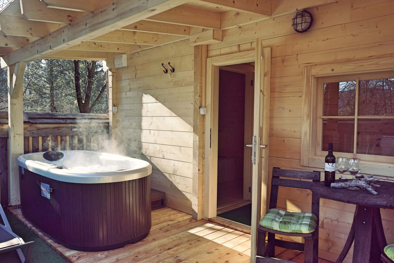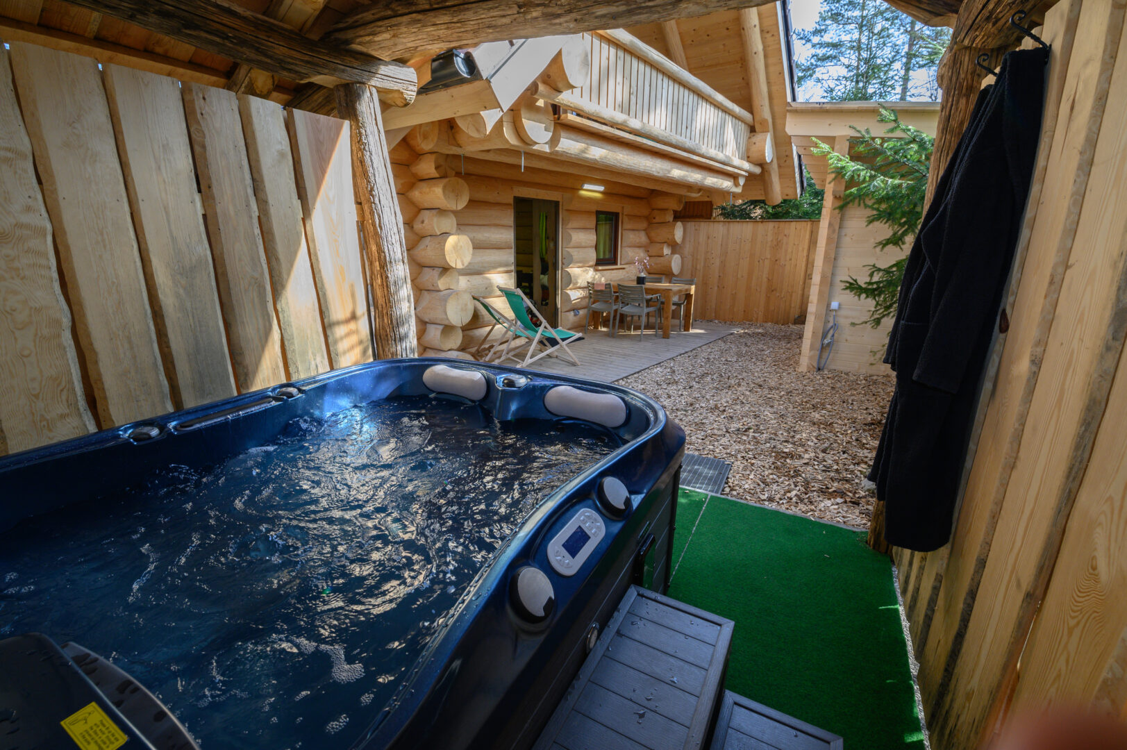 Hiške z jacuzzijem spadajo med mobilne hiške a so v celoti lesene, zunaj, na terasi pa imajo jacuzzi, ki omogoča sprostitev v popolni zasebnosti. Namestitev ima 3 spalnice in je primerna za bivanje do 6 oseb.