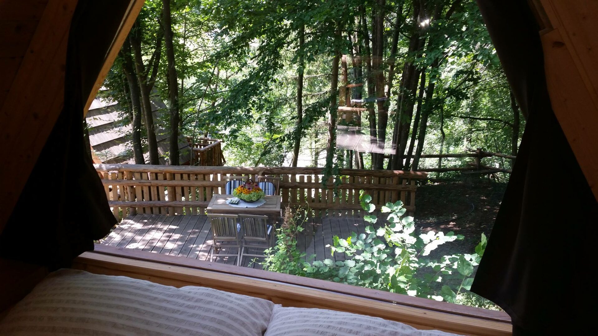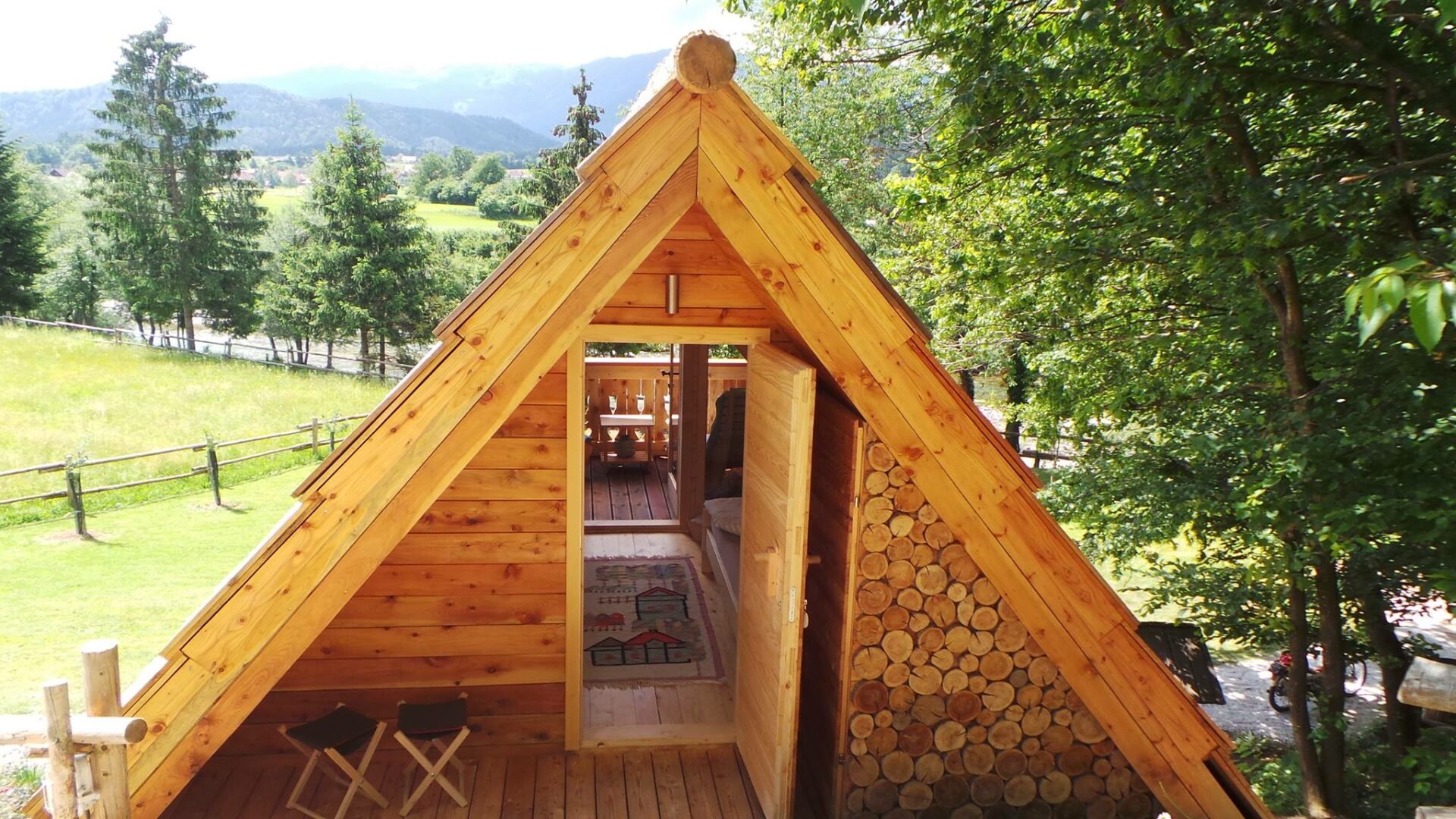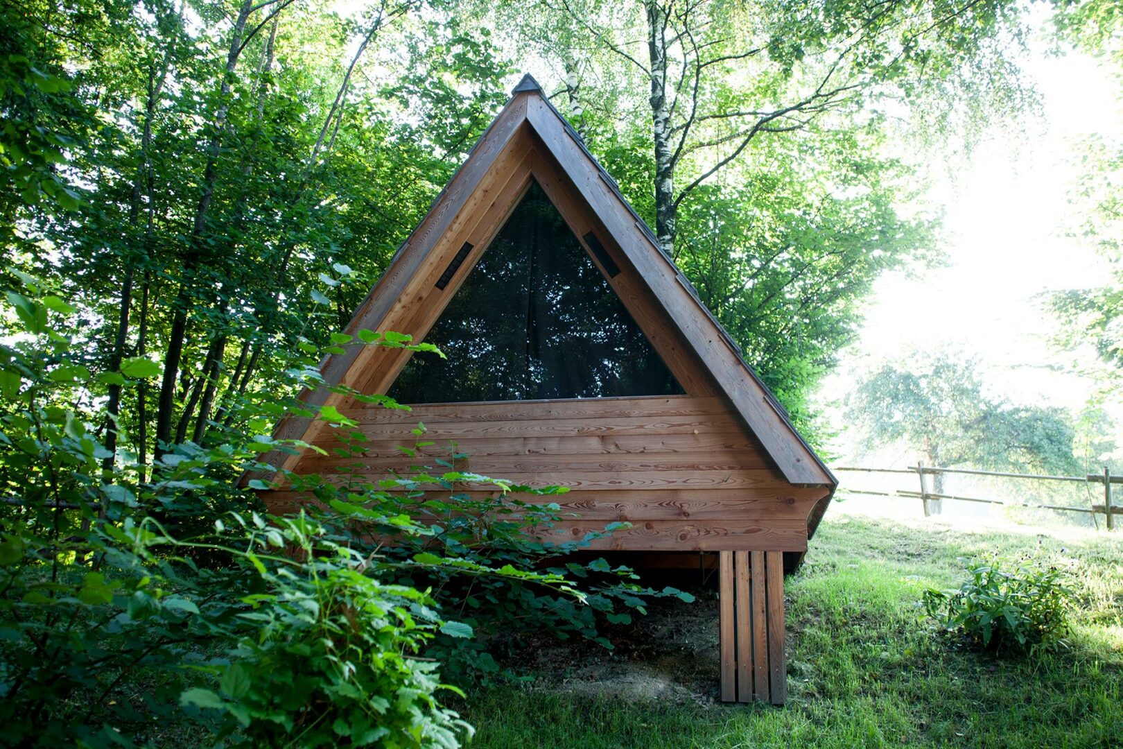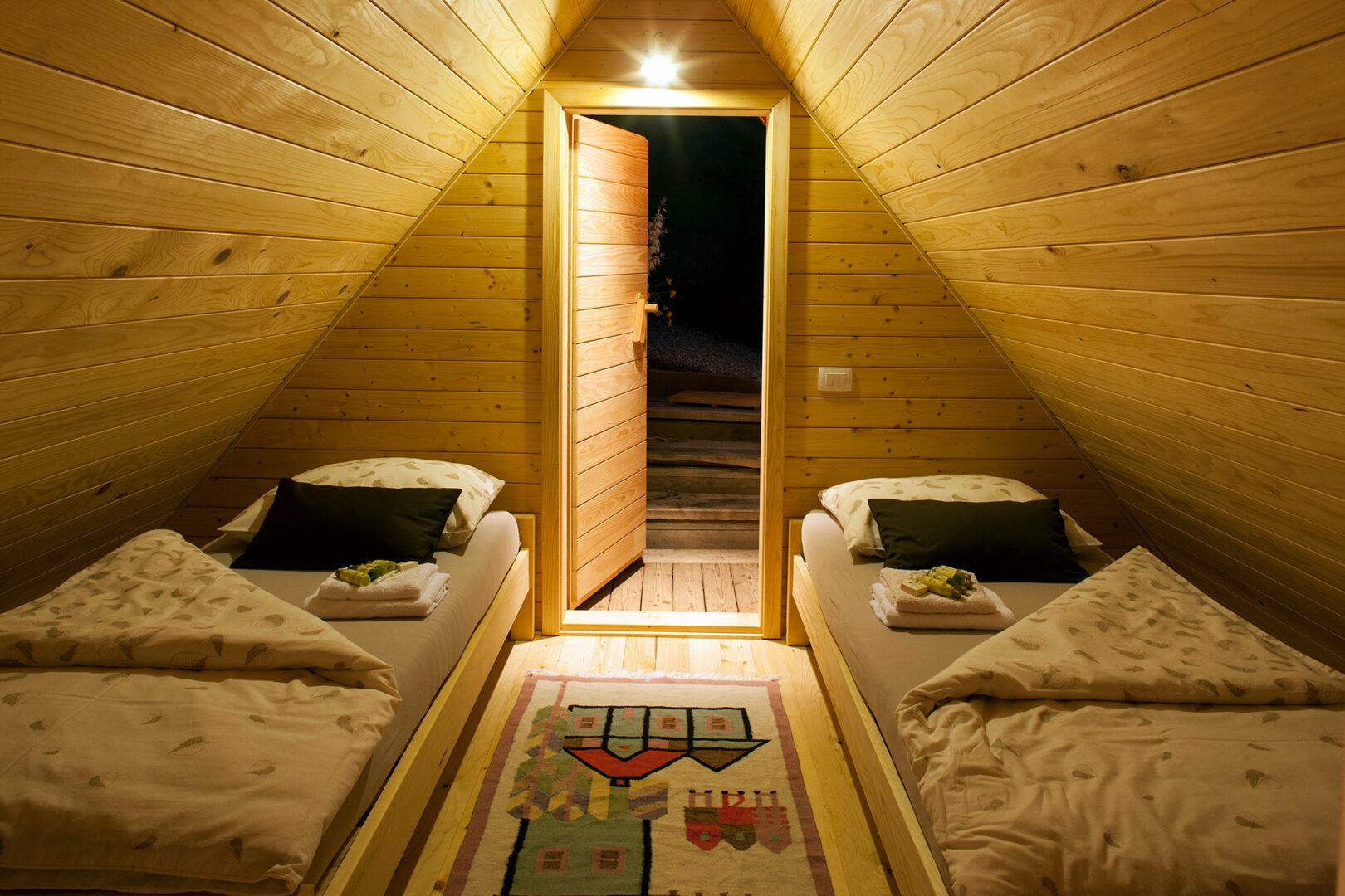 Vsaka hiška ima v notranjosti dve postelji z možnostjo dodatnega ležišča za otroka. Na južni strani hiške se razprostira panoramsko okno s pogledom na reko Savinjo in prostrana lesena terasa. Hiške so opremljene tudi z mini hladilnikom. V hišici so vam v uporabo na voljo brisače in posteljnina, z doplačilom vam pripravijo tudi zajtrk. Za goste lesenih trikotnih hišk so na voljo zasebne kopalnice oddaljene največ 50 metrov.