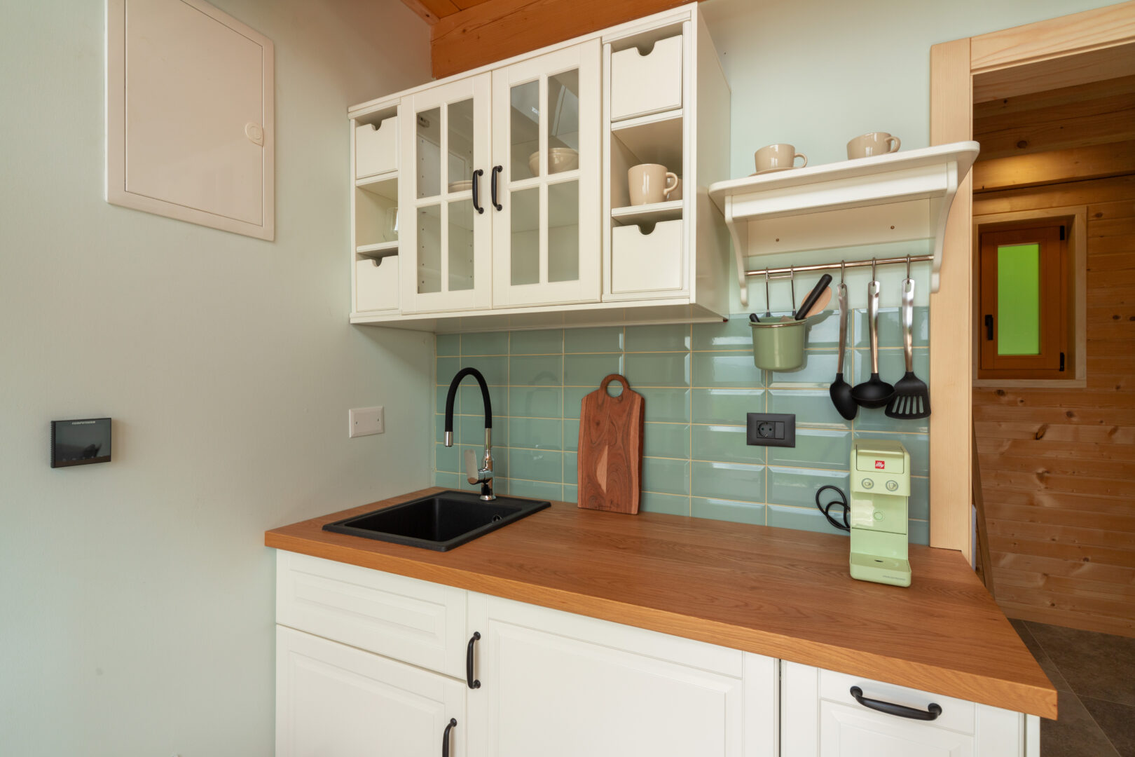 Družinska lesena hiška sprejme 4 osebe in je opremljena z vsem, kar potrebujete za udoben oddih. V notranjosti sta dve zakonski postelji (ena v spodnjem delu in druga na galeriji), na voljo je tudi brezplačna otroška posteljica. Otrokom so na voljo različne namizne igre.