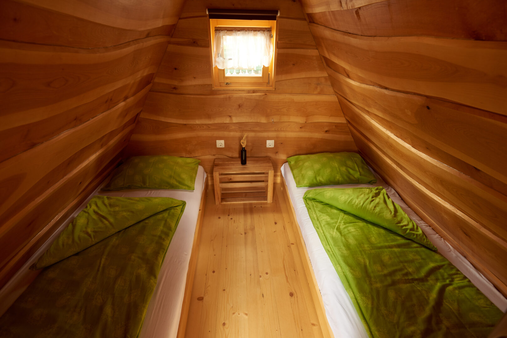 Mala lesena hiška ima manjšo polno opremljeno teraso, v notranjosti dve enojni ležišči, posteljnino, brisače, nočno omarico, elektriko, ogrevanje ter brezplačen Wi-Fi. Gostom je na voljo souporaba kopalnic in sanitarij, letna kuhinja ter skupni prostor z mini barom, družabnimi igrami in kaminom.