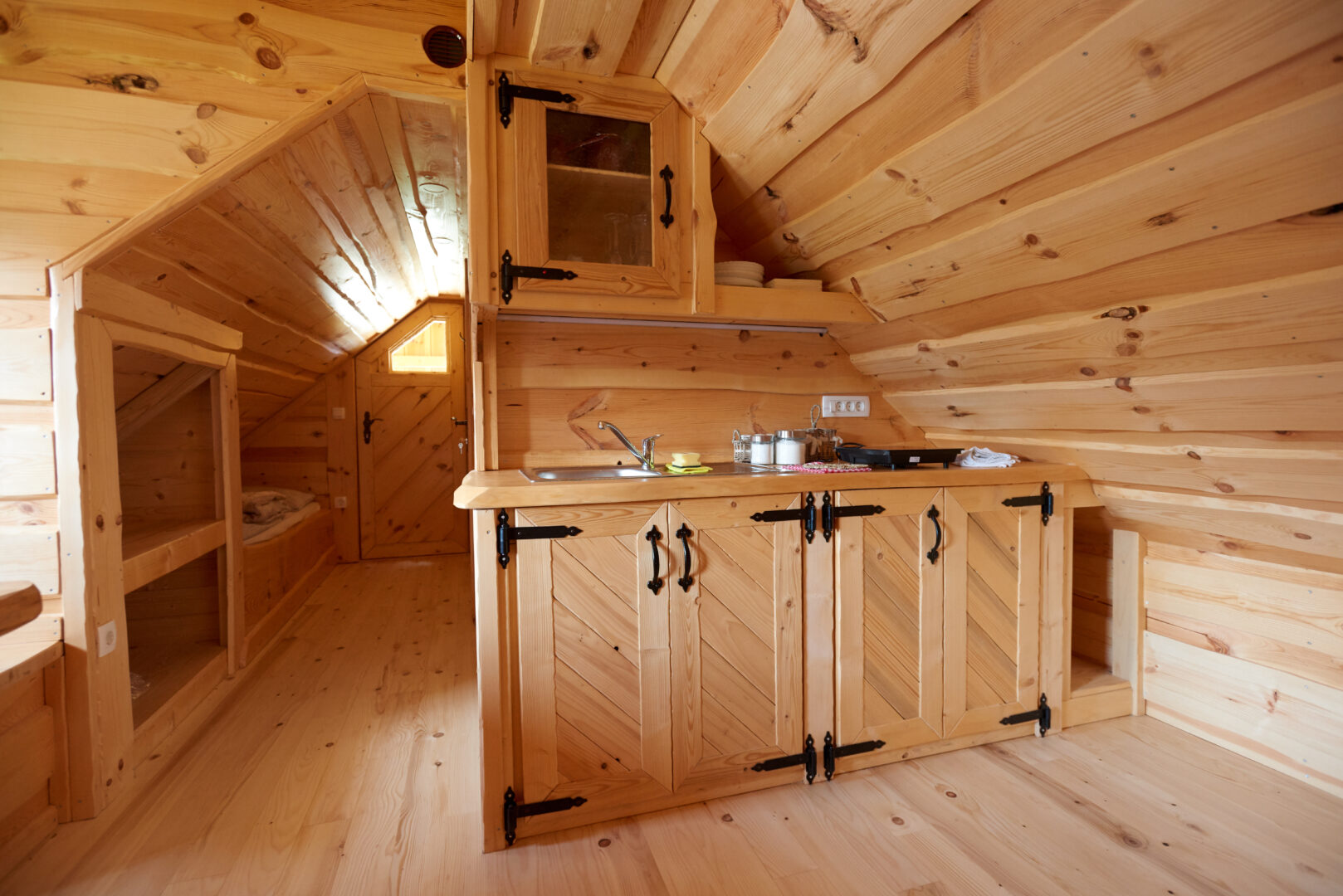 Mala lesena hiška ima manjšo polno opremljeno teraso, v notranjosti dve zakonski ležišči, posteljnino, brisače, nočno omarico, elektriko, ogrevanje ter brezplačen Wi-Fi. Gostom je na voljo souporaba kopalnic in sanitarij, letna kuhinja ter skupni prostor z mini barom, družabnimi igrami in kaminom.