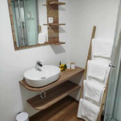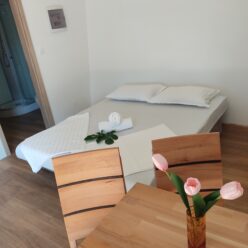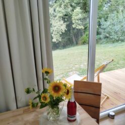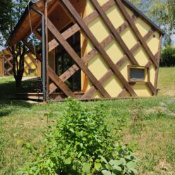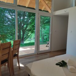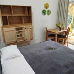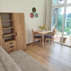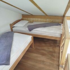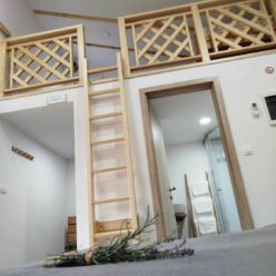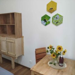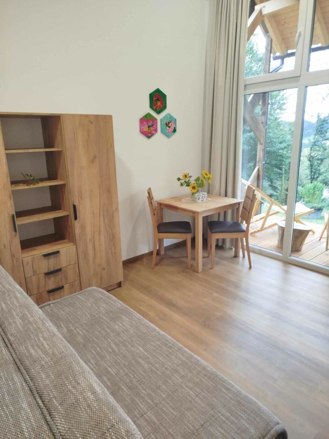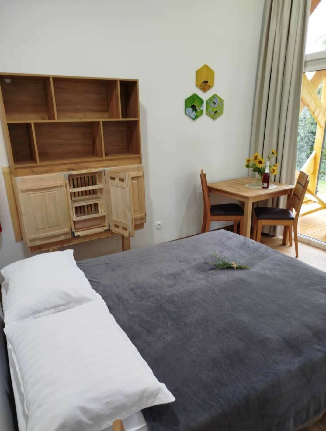 Apartma s čebelami ponuja pomirjujoč zvok brenčanja čebel in prijeten vonj po medu in propolisu. Brez skrbi—čebelice so varno nameščene v panjih, tako da boste lahko uživali v njihovem pomirjujočem brenčanju in terapevtskih učinkih aerosolov, brez neposrednega stika s čebelicami. Ta koncept ne le pomirja dušo, temveč ponuja edinstveno mešanico sprostitve in obnovitve z močjo narave. Na panjih so pomembna navodila za ravnanje s panji. Prostor je svetel in topel, kar omogoča veliko panoramsko okno. V spodnjem bivalnem prostoru se nahaja raztegljivi kavč, udoben za spanje (160×200), miza s štirimi stoli, omara za shranjevanje oblačil. Na galerijo, kjer sta dve ležišči, se boste vi ali vaši otroci povzpeli po lestvi s širokimi stopničkami. Na voljo so dodatne odeje. Kuhinja je opremljena z osnovno opremo (hladilnik, posoda, kozarci, pribor…). Na polici sladkor, kava, čaj, olje in kis, sol in poper. Pod lijakom koš za ločeno zbiranje odpadkov in osnovna čistila. V kopalnici je WC, tuš in umivalnik z ogledalom. Na voljo so brisače, milo za roke in tuš gel. Apartma je hajen in/ali ogrevan s klimatsko napravo.