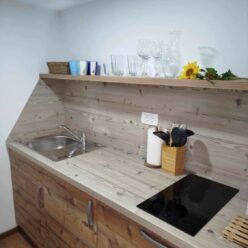 Apartma brez čebel je svetel in topel, saj ima veliko panoramsko okno. V spodnjem bivalnem prostoru se nahaja raztegljivi kavč, udoben za spanje (160×200), miza s štirimi stoli, omara za shranjevanje oblačil. Na galerijo, kjer sta dve ležišči, se boste vi ali vaši otroci povzpeli po lestvi s širokimi stopničkami. Na voljo so dodatne odeje. Kuhinja je opremljena z osnovno opremo (hladilnik, posoda, kozarci, pribor…). Na polici sladkor, kava, čaj, olje in kis, sol in poper. Pod lijakom koš za ločeno zbiranje odpadkov in osnovna čistila. V kopalnici je WC, tuš in umivalnik z ogledalom. Na voljo so brisače, milo za roke in tuš gel. Apartma je hajen in/ali ogrevan s klimatsko napravo.