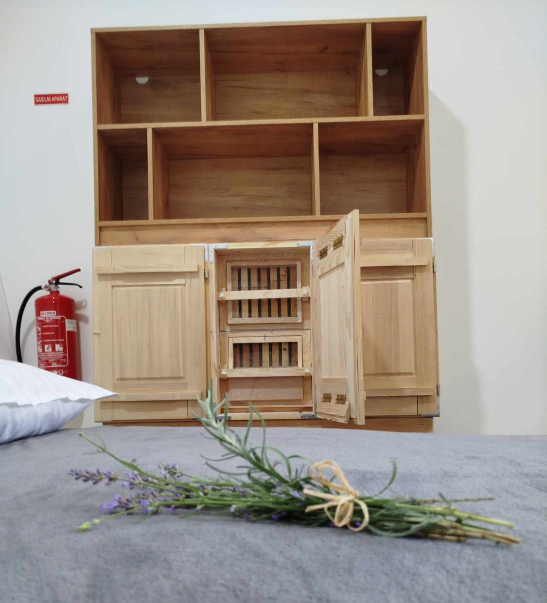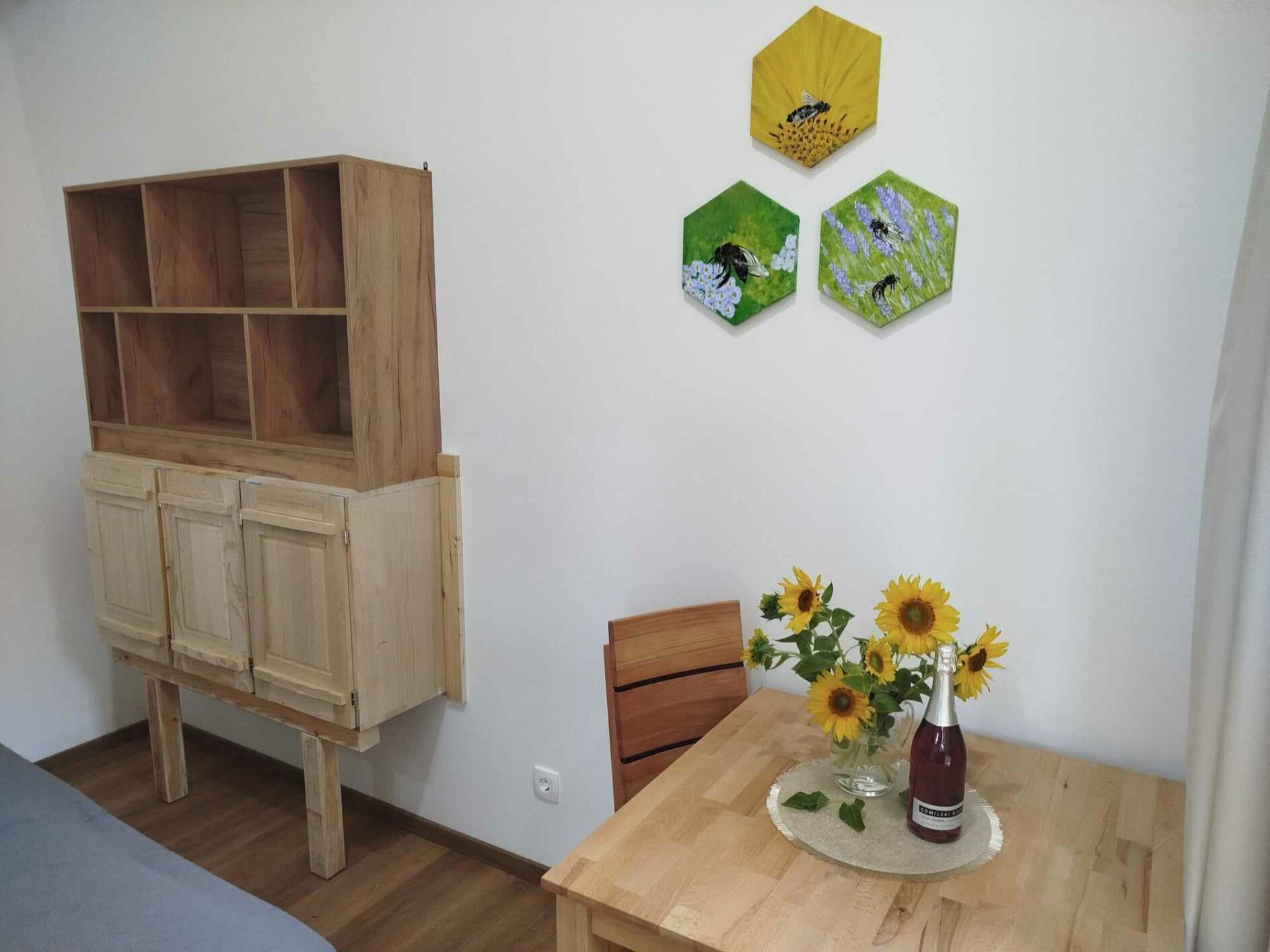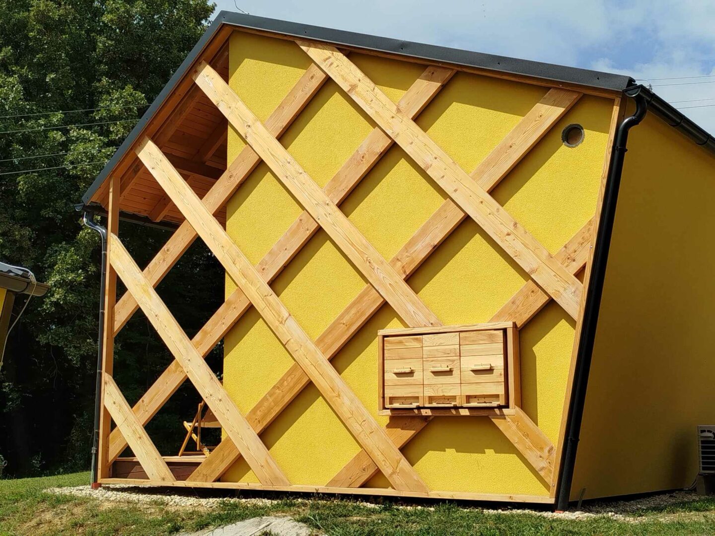 Apartma s čebelami ponuja pomirjujoč zvok brenčanja čebel in prijeten vonj po medu in propolisu. Brez skrbi—čebelice so varno nameščene v panjih, tako da boste lahko uživali v njihovem pomirjujočem brenčanju in terapevtskih učinkih aerosolov, brez neposrednega stika s čebelicami. Ta koncept ne le pomirja dušo, temveč ponuja edinstveno mešanico sprostitve in obnovitve z močjo narave. Na panjih so pomembna navodila za ravnanje s panji. Prostor je svetel in topel, kar omogoča veliko panoramsko okno. V spodnjem bivalnem prostoru se nahaja raztegljivi kavč, udoben za spanje (160×200), miza s štirimi stoli, omara za shranjevanje oblačil. Na galerijo, kjer sta dve ležišči, se boste vi ali vaši otroci povzpeli po lestvi s širokimi stopničkami. Na voljo so dodatne odeje. Kuhinja je opremljena z osnovno opremo (hladilnik, posoda, kozarci, pribor…). Na polici sladkor, kava, čaj, olje in kis, sol in poper. Pod lijakom koš za ločeno zbiranje odpadkov in osnovna čistila. V kopalnici je WC, tuš in umivalnik z ogledalom. Na voljo so brisače, milo za roke in tuš gel. Apartma je hajen in/ali ogrevan s klimatsko napravo.