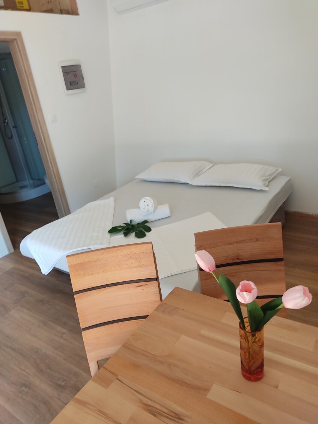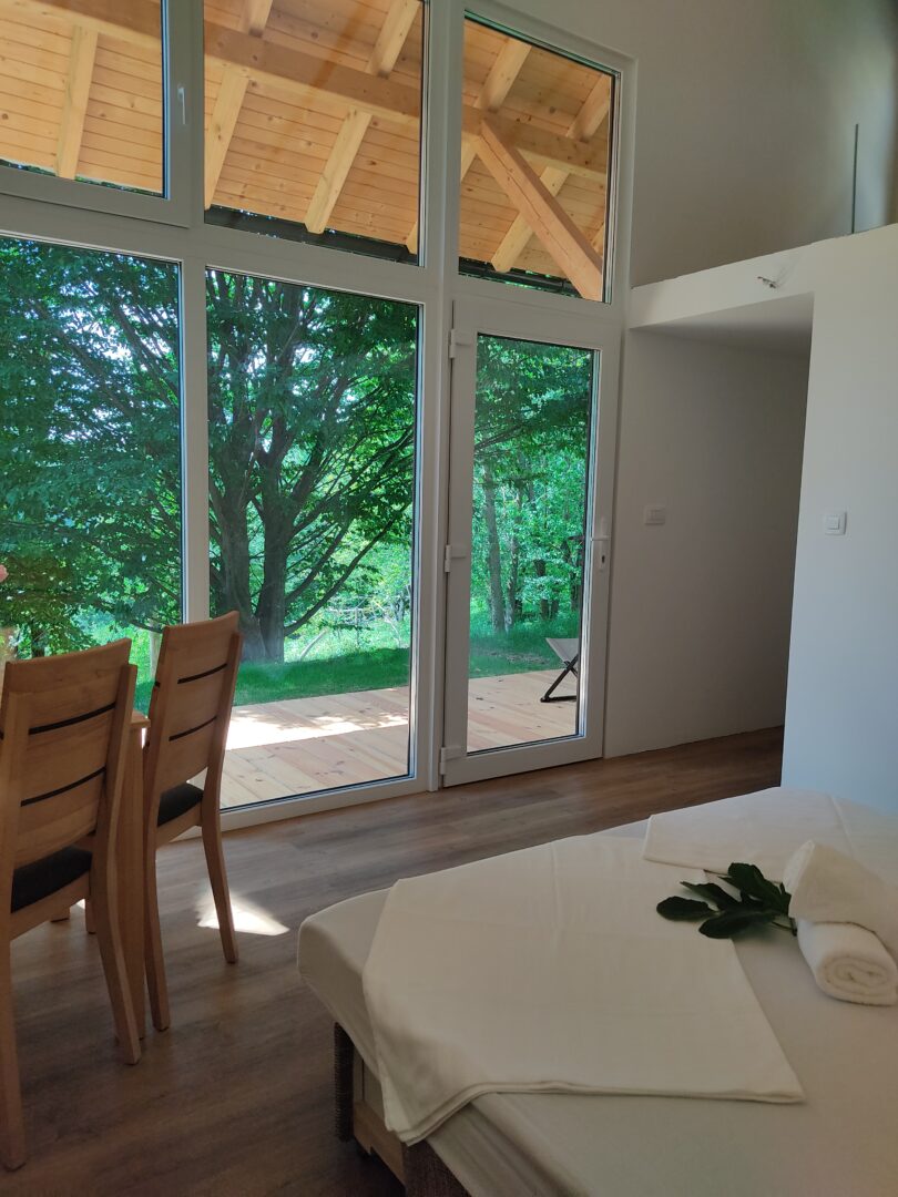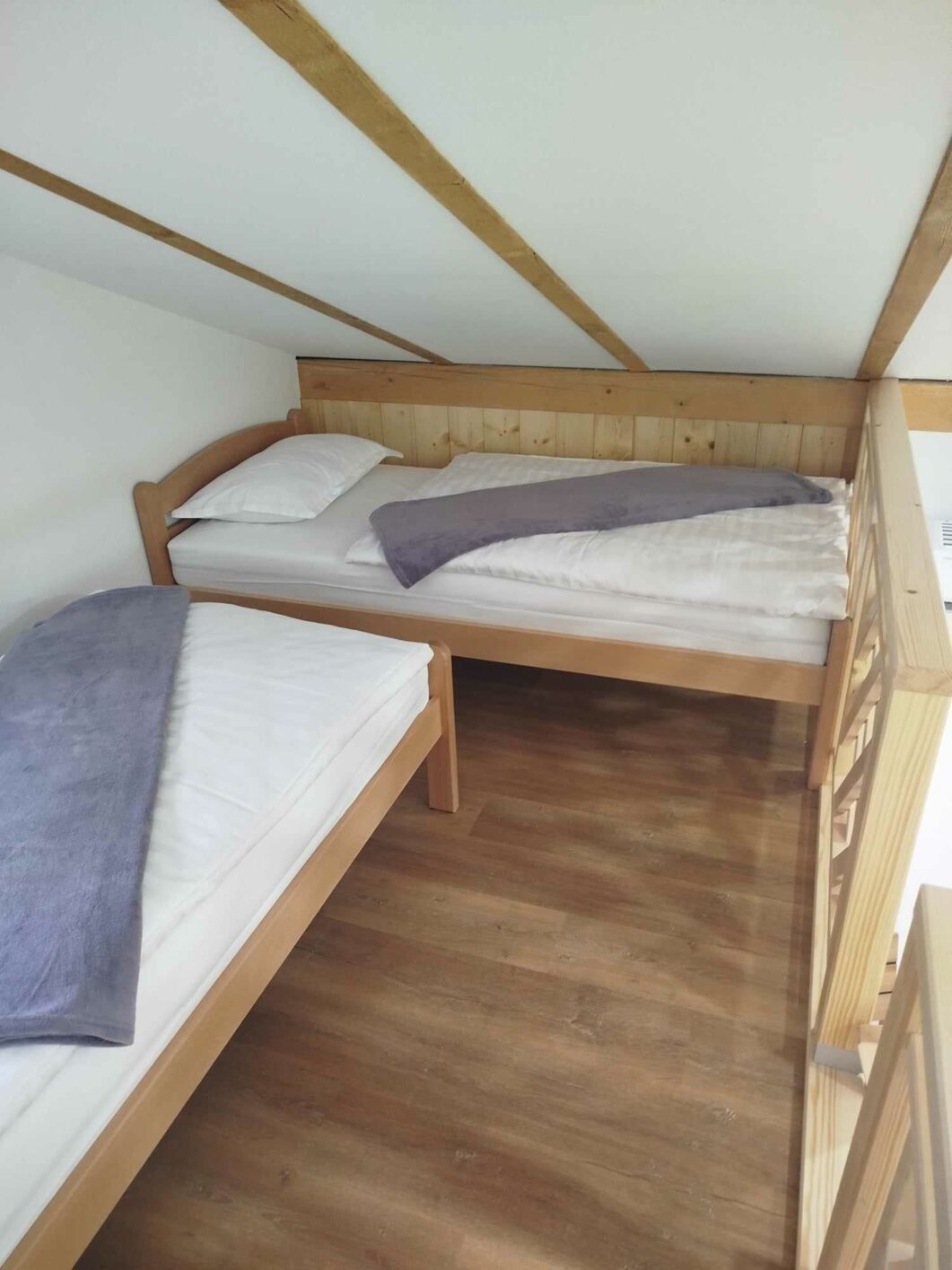 Apartma s čebelami ponuja pomirjujoč zvok brenčanja čebel in prijeten vonj po medu in propolisu. Brez skrbi—čebelice so varno nameščene v panjih, tako da boste lahko uživali v njihovem pomirjujočem brenčanju in terapevtskih učinkih aerosolov, brez neposrednega stika s čebelicami. Ta koncept ne le pomirja dušo, temveč ponuja edinstveno mešanico sprostitve in obnovitve z močjo narave. Na panjih so pomembna navodila za ravnanje s panji. Prostor je svetel in topel, kar omogoča veliko panoramsko okno. V spodnjem bivalnem prostoru se nahaja raztegljivi kavč, udoben za spanje (160×200), miza s štirimi stoli, omara za shranjevanje oblačil. Na galerijo, kjer sta dve ležišči, se boste vi ali vaši otroci povzpeli po lestvi s širokimi stopničkami. Na voljo so dodatne odeje. Kuhinja je opremljena z osnovno opremo (hladilnik, posoda, kozarci, pribor…). Na polici sladkor, kava, čaj, olje in kis, sol in poper. Pod lijakom koš za ločeno zbiranje odpadkov in osnovna čistila. V kopalnici je WC, tuš in umivalnik z ogledalom. Na voljo so brisače, milo za roke in tuš gel. Apartma je hajen in/ali ogrevan s klimatsko napravo.