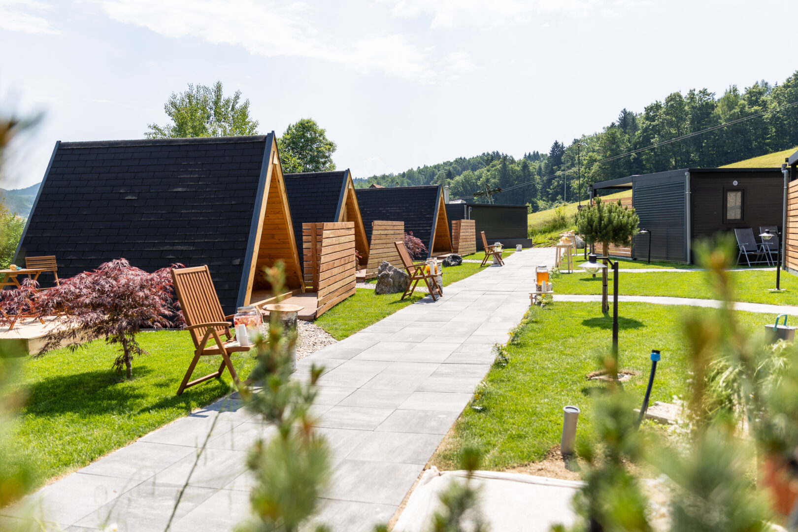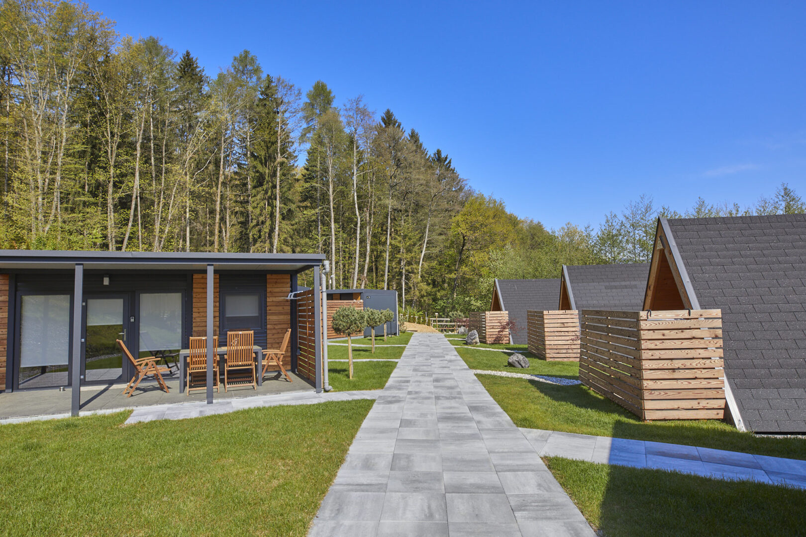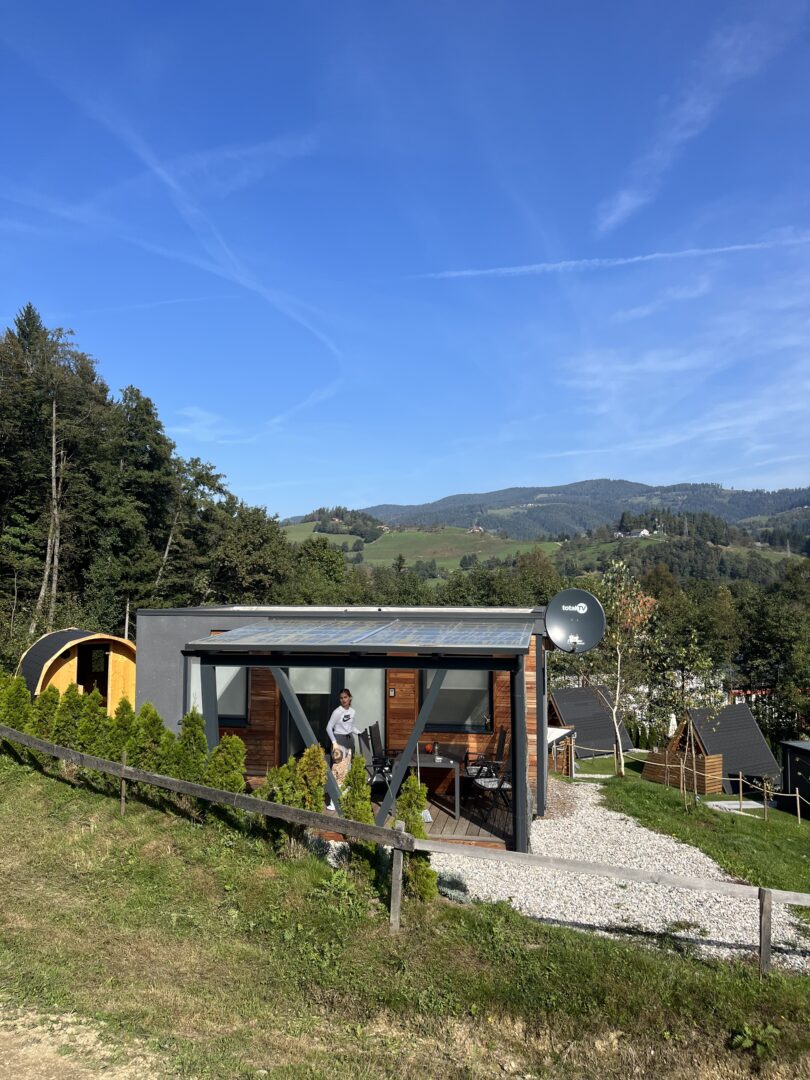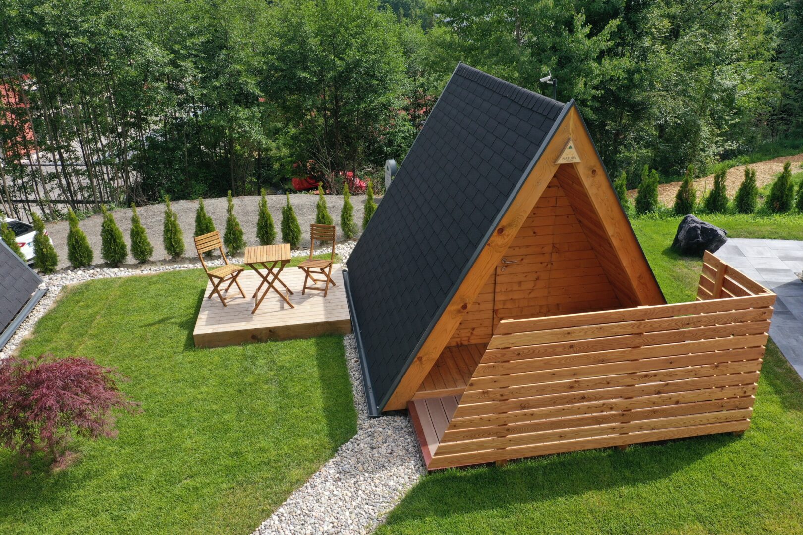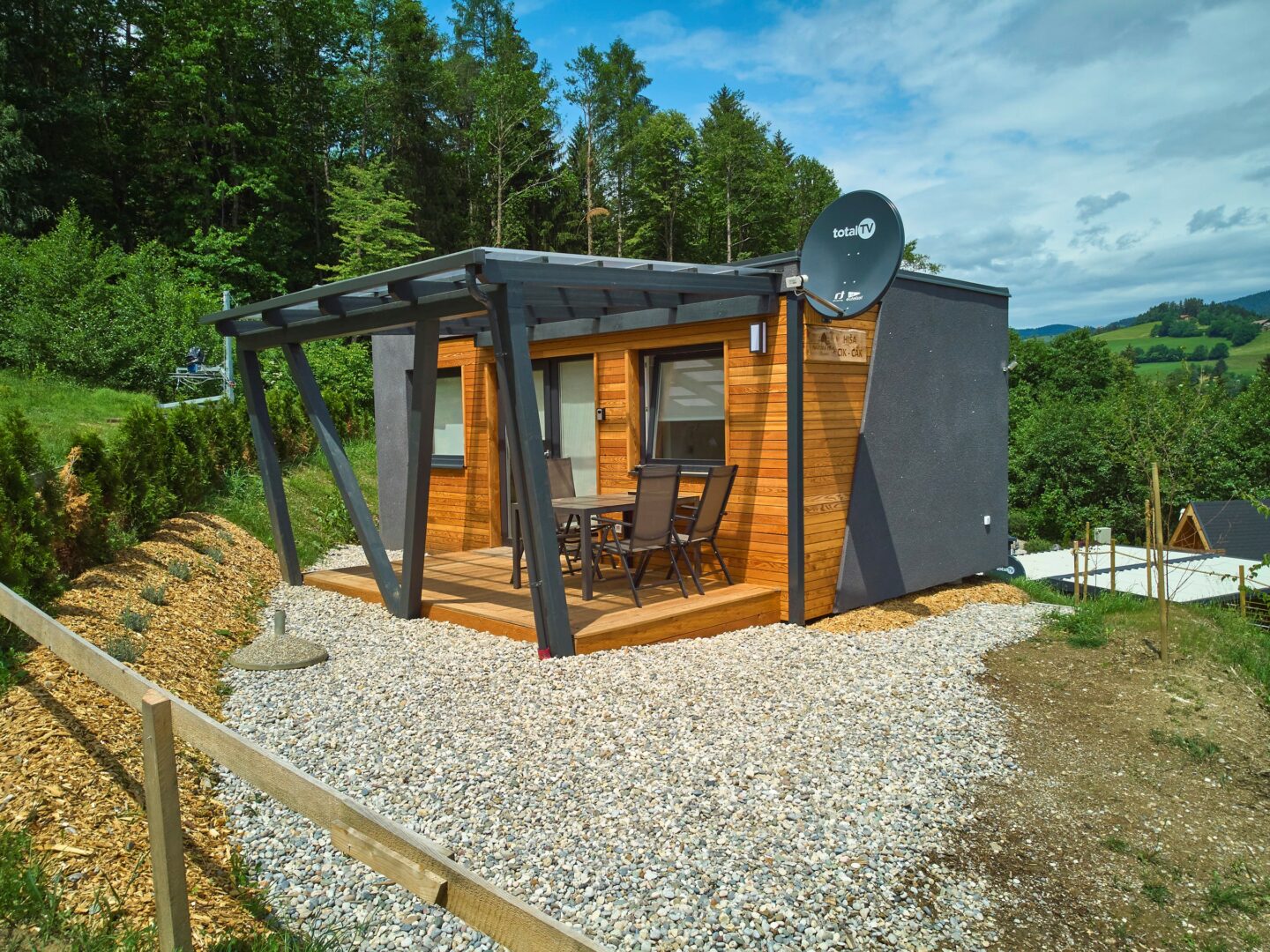Tri manjše lesene eko glamping hišice z zasebno teraso in urejenimi skupnimi prostori. Hiška bo zagotovo navdušila dva avanturista.