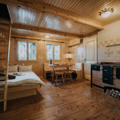 Koča Kronca je naša najmanjša koča, prenovljena v  starem in tradicionalnem stilu, kjer se prepletata domačnost, prvinskost in udobje. Koča leži na mirni lokacija, stran od vrveža in glavnih sprehajalnih poti. Ima kar dve terasi: eno skrito za ter eno veliko pred samo kočo. Preprostost koče nas ponese v vlogo pastirjev, kjer si ob starem “šporhetu” na drva pripravimo prijeten obrok ali pa zgolj uživamo v toplem večernem vzdušju prsketanja ognja. Majhna in simpatična koča ima veliko luksuzno kopalnico s talnim gretjem ter tušem s toplo vodo. Zgornja soba je pravi raj za otroke ali skupine prijateljev. Osrednji prostor poln topline pa je opremljen s kuhinjo, jedilnim kotom ter kavčem, ki je idealen za posteljo za dve osebi, ki želita mirnega oddiha v toplem gnezdecu. Koča je idealna za pare ali eno družino in lahko sprejme 7 oseb, dobrodošli pa so tudi hišni ljubljenčki.