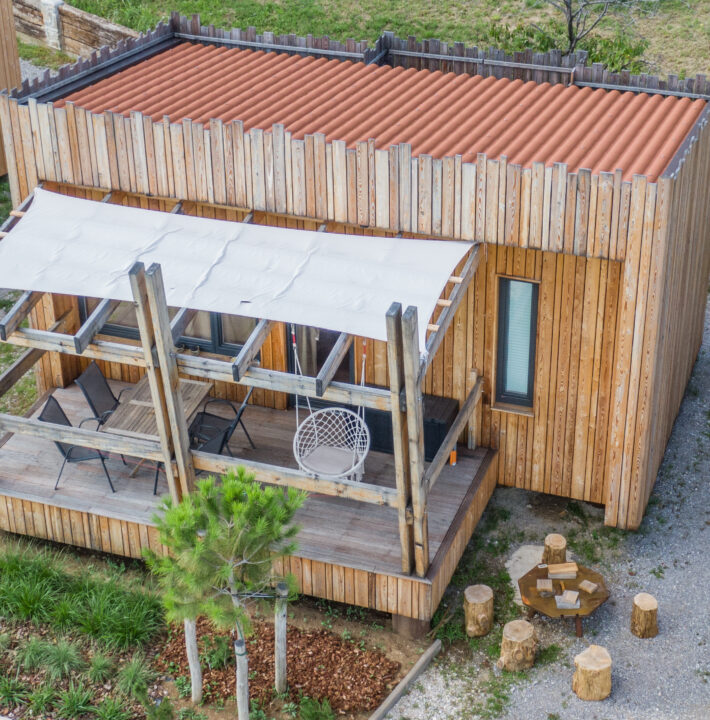 Na idilični lokaciji na vzpetini ob robu vasi z razgledi na Vipavsko dolino boste doživeli pristno povezanost z naravo v edinstevnih ter ročno izdelanih lesenih hiškah.